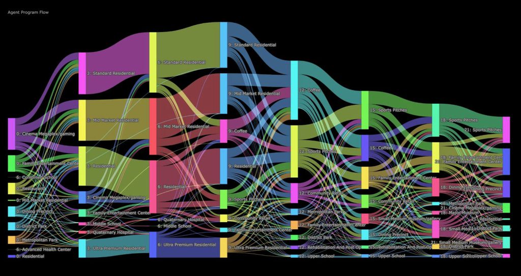 Macro flow of agent personas throughout the day; Demonstrating the probabilistic flow of people from one destination to the next, over the course of 24 hours